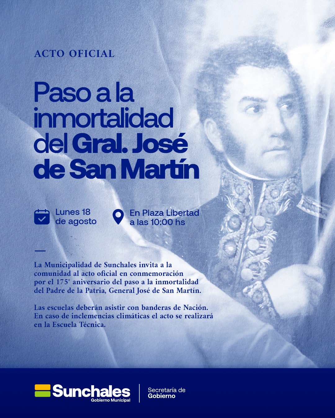 La Municipalidad de Sunchales invita a la comunidad a participar el acto oficial en el marco de la conmemoración del 175° aniversario del paso a la inmortalidad del Padre la Patria, Gral. José de San Martín, a realizarse el próximo lunes 18 de agosto a la hora 10 en Plaza Libertad.