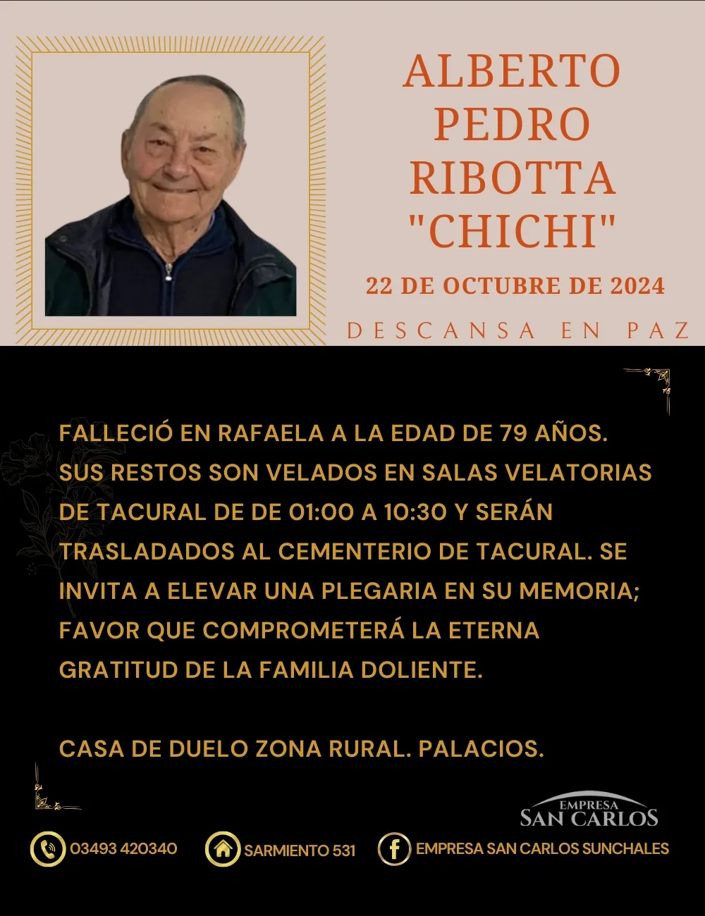 Falleció en Rafaela a la edad de 79 años. Sus restos son velados en salas velatorias de Tacural de de 01.00 a 10.30 y serán trasladados al cementerio de Tacural. Se invita a elevar una plegaria en su memoria; favor que comprometerá la eterna gratitud de la familia doliente.
