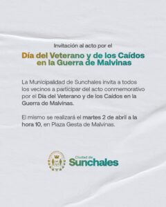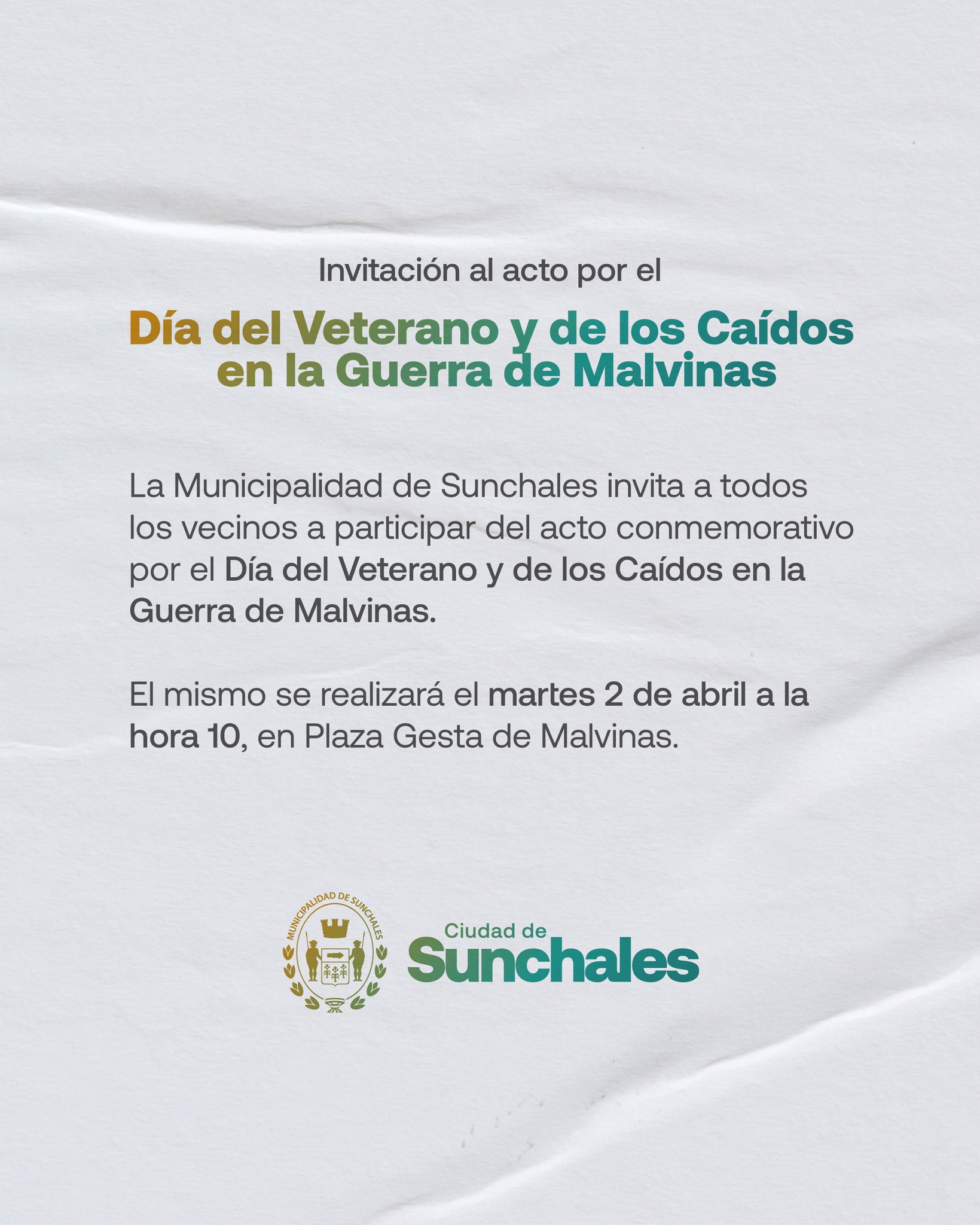 La Municipalidad de Sunchales invita a todos los vecinos a participar del Acto por el Día del Veterano y los Caídos en la Guerra de Malvinas.