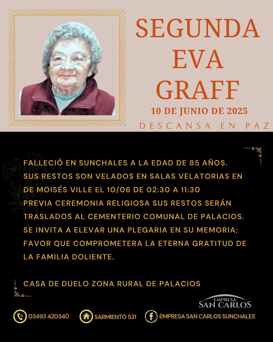 fallecio en sunchales, Sra Segunda Eva Graff