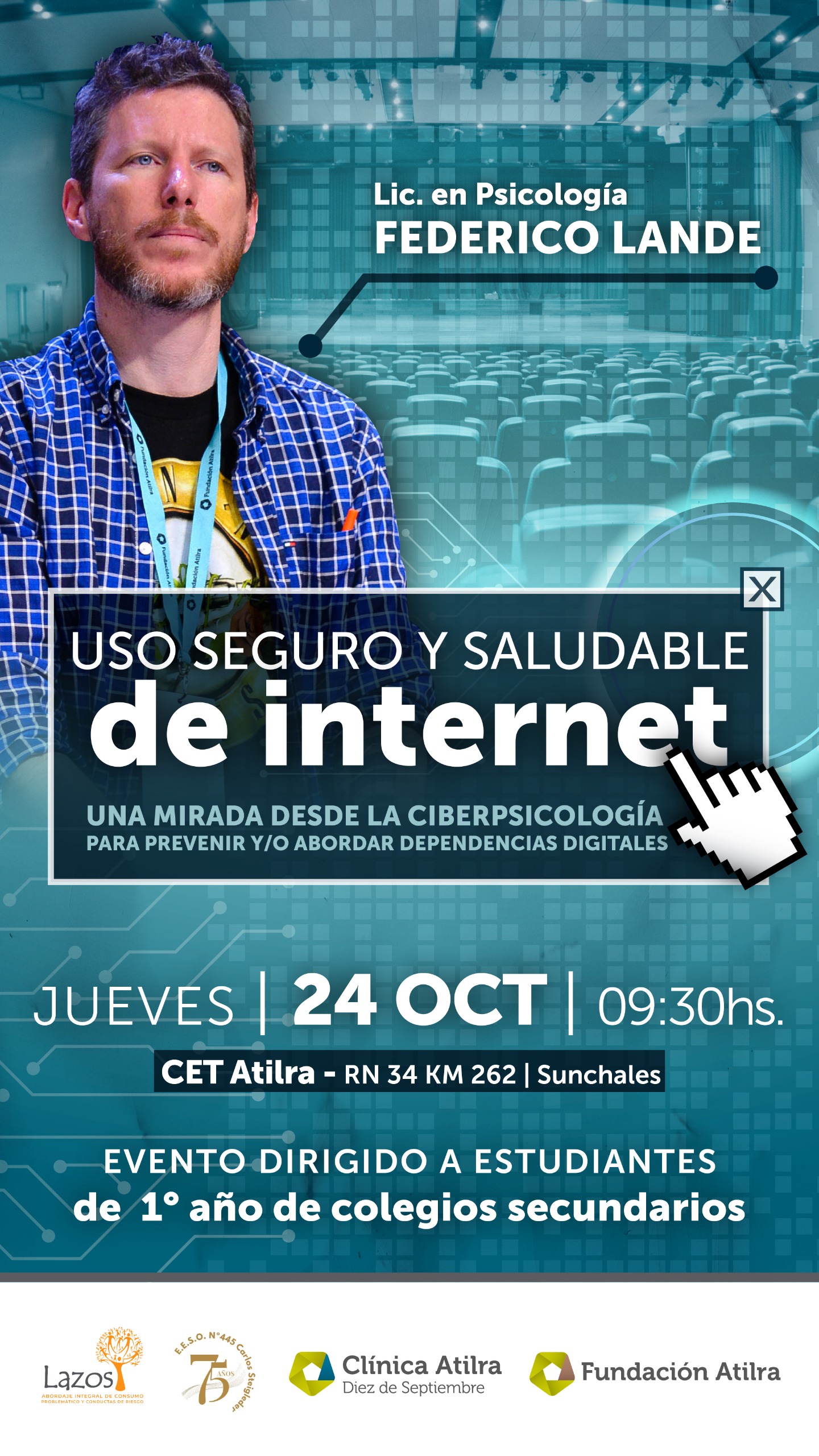 La charla se llevará adelante el jueves 24 de octubre, desde las 9.30hs, en el CET Atilra y contará con la participación de Federico Lande, divulgador científico y terapeuta especializado en ciberpsicología, quien compartirá su experiencia y conocimiento sobre los efectos de la tecnología en la salud mental.