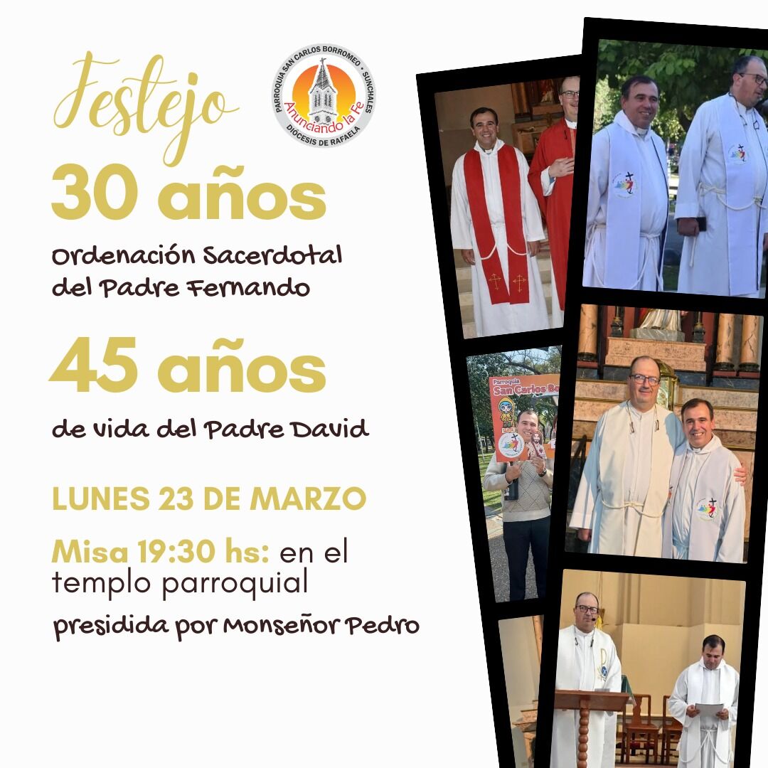 La Parroquia San Carlos Borromeo de Sunchales tiene el honor de invitar a toda la comunidad a celebrar los 30 años de ordenación sacerdotal del Padre Fernando y los 45 años de vida del Padre David con una misa solemne presidida por Monseñor Pedro.