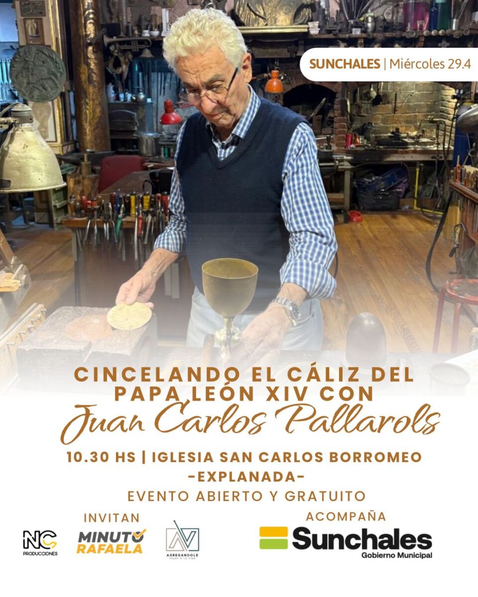 La ciudad de Sunchales recibirá el próximo miércoles 29 de abril al reconocido orfebre argentino Juan Carlos Pallarols, en el marco de su gira nacional con el cáliz destinado al Papa León XIV, una pieza única de profundo valor espiritual y cultural que recorre el país incorporando el aporte simbólico de miles de personas.
