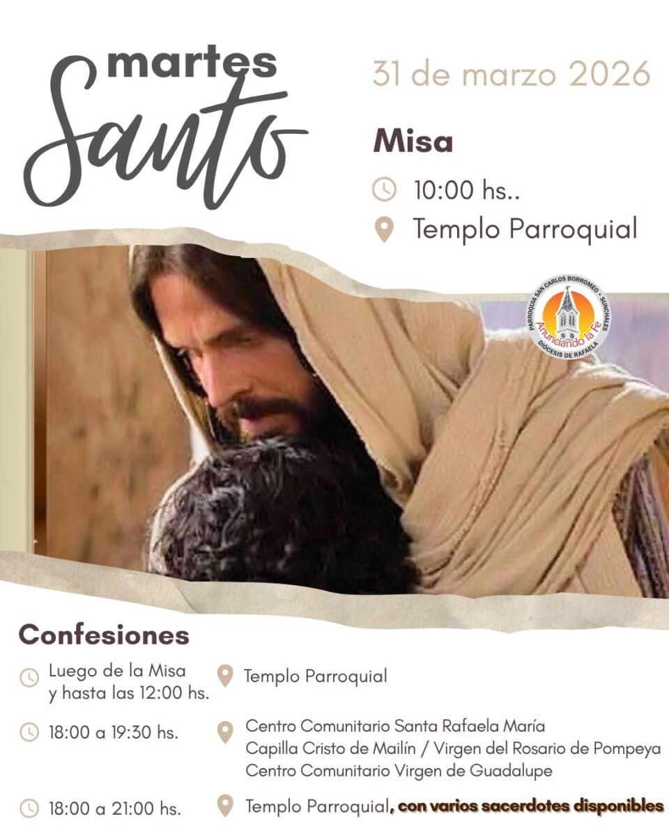 La Arquidiócesis San Carlos Borromeo Sunchales, presenta la programación del Martes Santo, 31 de marzo de 2026, con actividades especiales para la comunidad de fe.