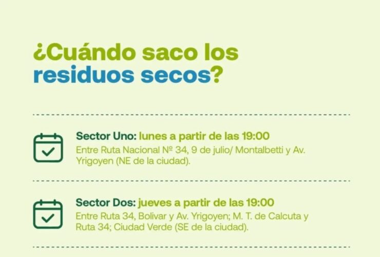 Sector Uno: lunes a partir de las 19:00 hs. Ubicación: entre Ruta Nacional Nº 34, 9 de julio/Montalbetti y Av. Yrigoyen (NE de la ciudad). Sector Dos: jueves a partir de las 19:00 hs. Ubicación: entre Ruta 34, Bolívar y ...