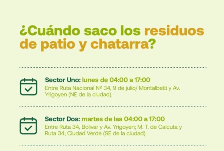 Sector Uno: lunes de 04:00 a 17:00. Entre Ruta Nacional Nº 34, 9 de julio/Montalbetti y Av. Yrigoyen (NE de la ciudad). Sector Dos: martes de 04:00 a 17:00. Entre Ruta 34, Bolívar y Av. Yrigoyen; M. T. de Calcuta ...