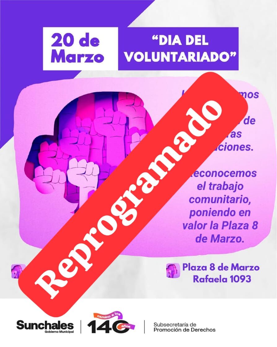 El acto previsto para hoy a la hora 17 en Plaza «8 de marzo» (Rafaela 1093) por el Día del Voluntariado se suspende debido a las malas condiciones climáticas.