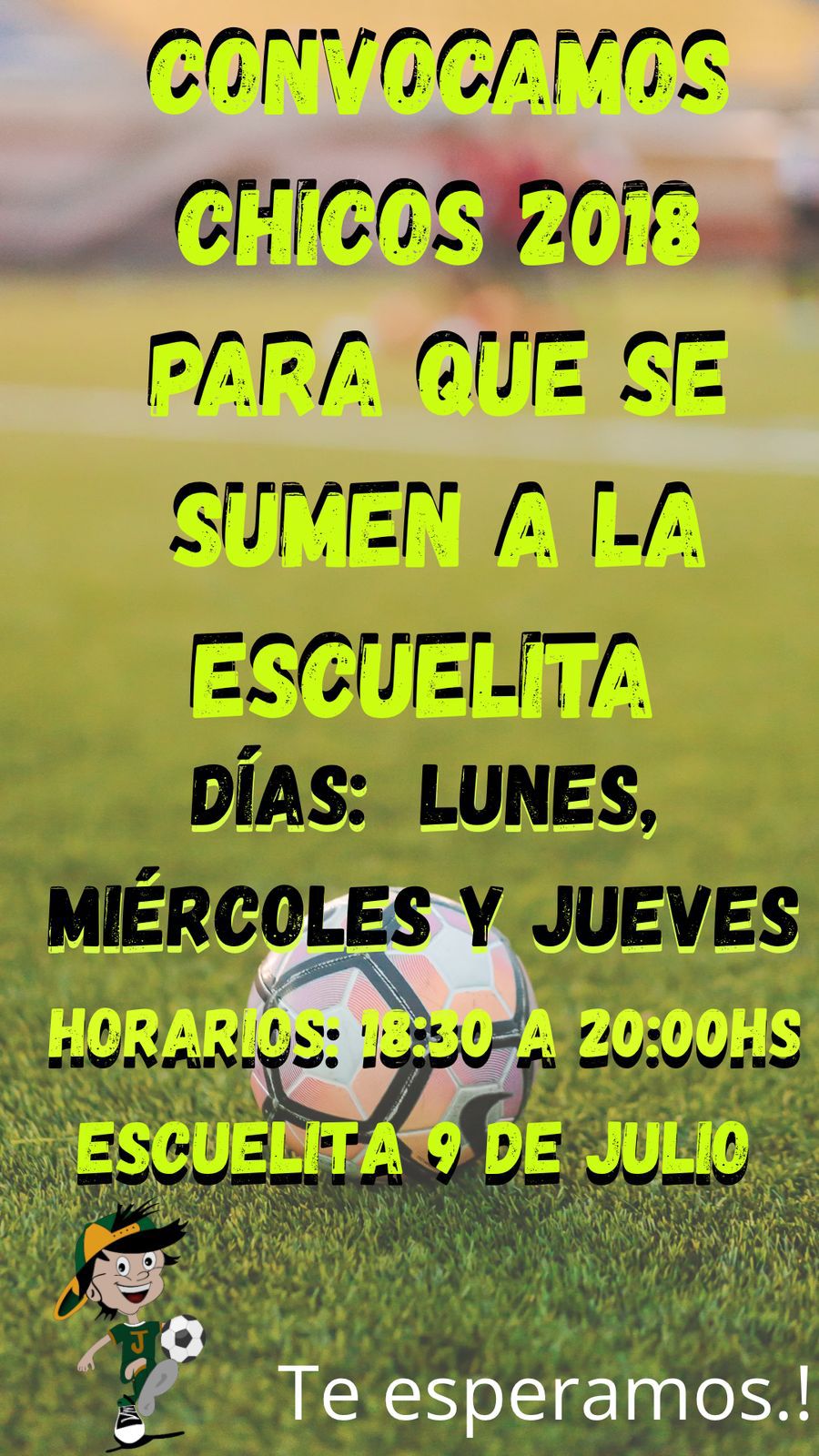 La vecinal barrio 9 de julio convoca a participar de la escuelita de futbol categoria 2018, dias lunes miercoles y jueves de 18.30 a 20.00